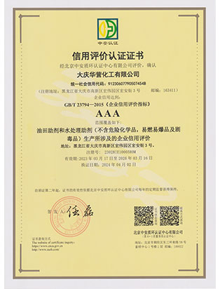 大慶華營化工有限公司成立于2006年7月10日,注冊資金3300萬元,公司類型為有限責(zé)任公司。位于大慶高新技術(shù)產(chǎn)業(yè)開發(fā)區(qū)宏偉園區(qū),是一家集油田助劑產(chǎn)品的研發(fā)、生產(chǎn)、銷售和技術(shù)服務(wù)為一體的現(xiàn)代化高新技術(shù)企業(yè)。公司注重科技創(chuàng)新,公司擁有18項(xiàng)自主知識產(chǎn)權(quán)。企業(yè)承擔(dān)過國家火炬計劃重點(diǎn)項(xiàng)目、國家科技型中小企業(yè)創(chuàng)新項(xiàng)目等,2011年被科技部火炬高新技術(shù)產(chǎn)業(yè)開發(fā)中心評為國家火炬計劃重點(diǎn)高新技術(shù)企業(yè)。公司十余種產(chǎn)品獲得中國石油天然氣集團(tuán)公司產(chǎn)品質(zhì)量認(rèn)可證書,其中粘穩(wěn)型驅(qū)油劑獲國家火炬計劃重點(diǎn)項(xiàng)目證書。公司憑借多年對大慶油田及周邊油田地質(zhì)情況的研究,可針對各油田地層特點(diǎn)調(diào)整產(chǎn)品的配方,更好地發(fā)揮各類油田助劑的性能。
